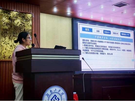 随后,指导教师刘娟从赛事流程、赛制规则到备赛要点进行了系统讲解。她以校赛、省赛、国赛三级晋级体系为主线,详细介绍了报名、调研设计、数据收集与分析、报告撰写及答辩展示等关键环节,帮助同学们全面把握赛事节奏与要求。