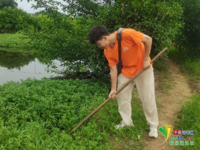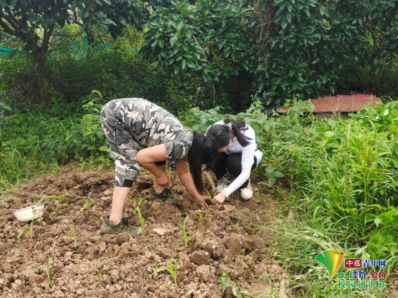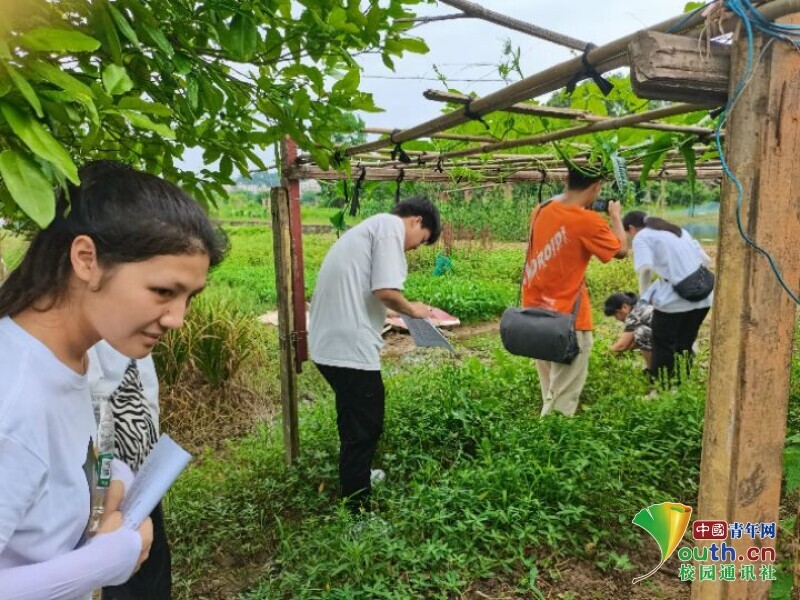 图为“农产品种植产业现状调查和助力乡村振兴”暑期社会实践团在农田里劳作