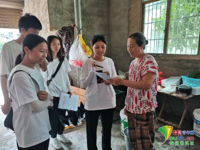 图为“农产品种植产业现状调查和助力乡村振兴”暑期社会实践团对西渡镇当地居民进行问卷调查