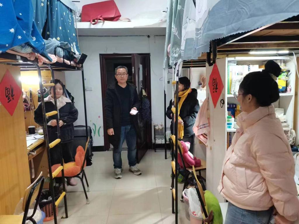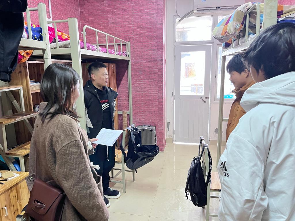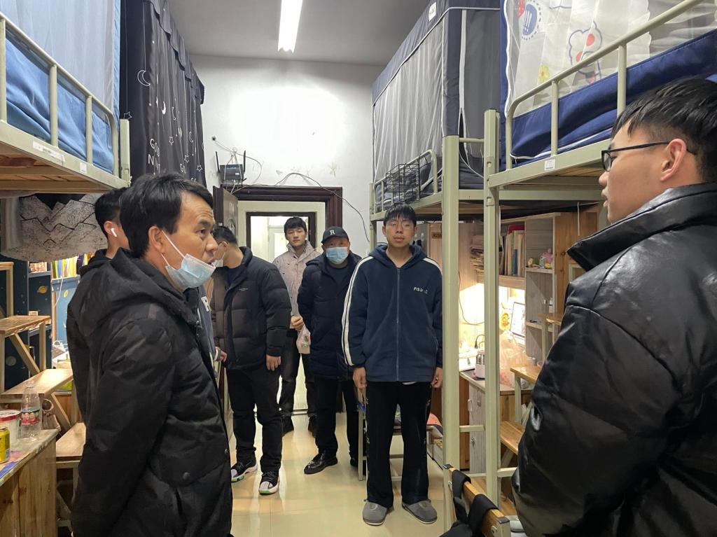 走访学生宿舍时,学院领导、辅导员和班主任整体查看了宿舍环境和卫生,并详细询问大家的学习、生活及疫情情况,并就审核评估的基本知识、上课出勤、课堂纪律、文明礼仪等方面对学生进行了再次强调。宁书记叮嘱同学们:学校的事情就是我们每一个人的事情,希望同学们以饱满的热情、务实的态度迎接评估、参与评估,保持好宿舍整洁卫生,注重文明礼仪,展现理院学子“明理、致诚、求真”的良好精神风貌。刘院长从个人的成长经历讲起,希望同学们树立远大的目标,他强调:“同学们要把更多的时间和精力投入到学习之中,珍惜时光,努力磨砺过硬本领,争取更大进步。”班主任老师们要求同学们注意宿舍用电安全,及时排查安全隐患,强化网络安全意识等。