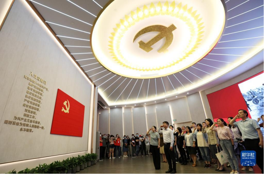 党员在上海中共一大纪念馆里重温入党誓词(2021年6月3日摄)。新华社记者 刘颖 摄