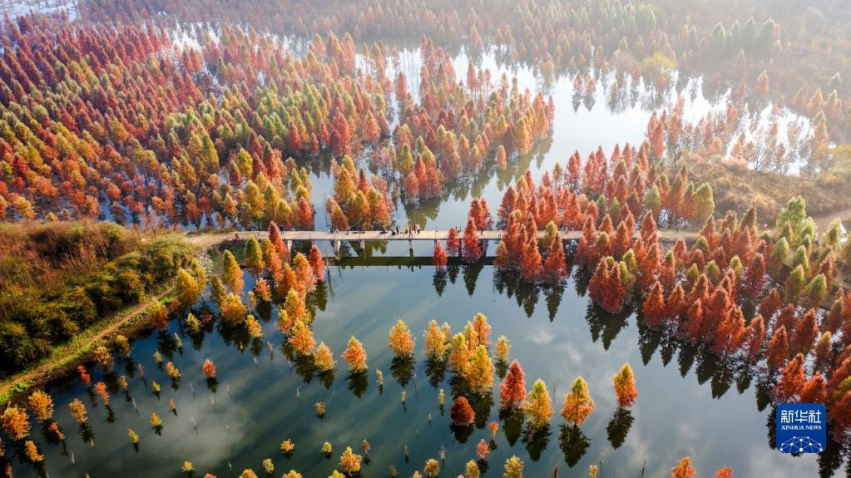 2021年12月10日拍摄的云南省昆明市的甸尾村水杉湿地一景(无人机照片)。新华社记者 胡超 摄