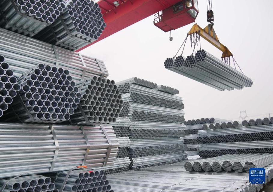 河北省迁安市一家镀锌管生产企业的工人操作机械设备吊运钢管(2021年12月11日摄)。新华社记者 杨世尧 摄