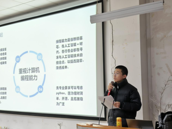 统计2202班李子潇同学以《心向往之,行则将至》为题进行宣讲。他首先带领大家学习了近年来国家推动大数据与人工智能领域发展的相关政策和文件,进而结合自身梳理了新时代大学生肩负的责任与使命。接着他强调了学生在专业课程、基础数学、计算机编程等方面学习的重要性,并分享了提升个人成绩、突破自我的方法。最后,他借助网络上热议的“分子分母的讨论”话题,阐述了优秀并无固定标准,鼓励每个人应寻找到自己独特的人生道路,并坚定地走下去。
