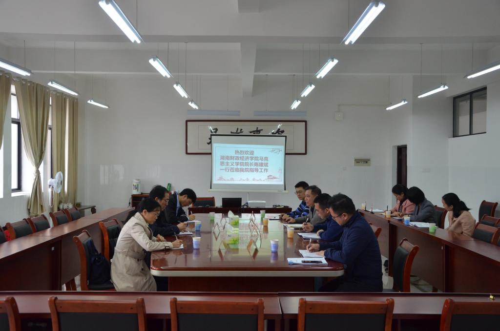 10月19日上午,湖南财政经济学院马克思主义学院院长陈建斌一行来我院就思政课教学改革创新和马克思主义学院建设进行调研交流。院长肖中云,院党总支书记张冬毛,副院长段锐、伍小乐,学院部分教研室主任、教师参加了本次座谈。