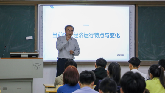 4月11日,在社科楼203教室,校党委委员、副校长何建雄以《脆弱复苏的世界经济》为题,给物理2201-2班、工设2201班讲了一堂精彩的“形势与政策”课。