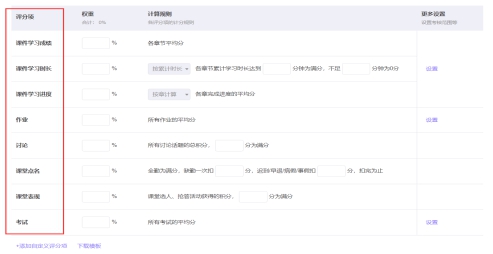 设置学生的考核策略时,请按照课程实际情况,将课件、作业等活动的得分(建议设置课件学习成绩占30%;课件学习时长占30%,累计学习时长达180分钟为满分,不足20分钟为0分;课件学习进度占20%;作业占20%),按比例计入课程汇总成绩。所有考核项之和应为100%。