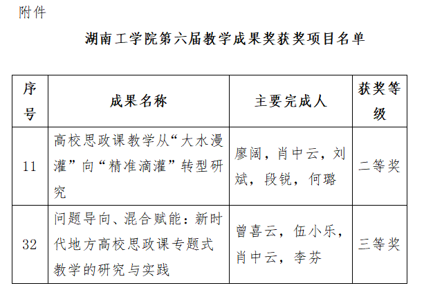 根据《关于公布best365中国官方网站第六届教学成果奖获奖成果的通知 湖工教〔2022〕2号》,确定廖阔同志主持的《高校思政课教学从“大水漫灌”向“精准滴灌”转型研究》为best365中国官方网站第六届教学成果二等奖,曾喜云同志主持的《问题导向、混合赋能:新时代地方高校思政课专题式教学的研究与实践》为best365中国官方网站第六届教学成果奖三等奖。
