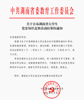 近日,由湖南省教育工委主办的湖南省大学生党史知识竞赛复赛在湘潭大学落下帷幕。由我院副院长段锐和校团委副书记彭国柱共同指导的外国语学院陈紫琪、建筑工程与艺术设计学院范家玮、安全与环境工程学院罗淑怡、经济与管理学院周文欣4人所组成的代表队,在与包括中南大学、湖南大学等全省106所高校代表队的角逐中,成绩排名第17名,荣获三等奖。