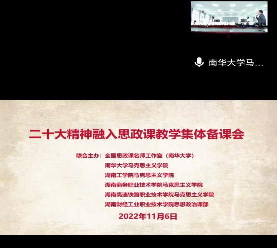 为深入学习宣传、贯彻落实党的二十大精神,全面深入推进党的二十大精神进教材、进课堂、进学生头脑,增强思政课教学的时代性、针对性和实效性。11月6日,best365马克思主义学院与南华大学、湖南商务职业技术学院、湖南高速铁路职业技术学院和湖南财经工业职业技术学院等五校马克思主义学院联合开展党的二十大精神融入思政课教学的集体备课活动。