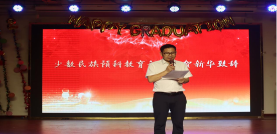 少数民族预科教育部主任贺新华发表动情结业讲话。他以“感恩‘预’见,首航有我”为主线,深情回顾了预科老师和学生以主人翁精神倾心开启预科自主培养的点滴画面;以“心向大海、破浪前行”为主题,深情寄语首届预科生三点希望。他说,翻开预科的历史,感受党和国家的温暖如故,从未体会到所从事的事业如此神圣荣光;开启预科的培养,感受学校党委行政的关爱有加,更能体会所从事的工作理想如光和责任如山。你我都在努力,大家都在发光,经受了前所未有的考验,也收获了前所未有的成长,相信努力的你我,都会越来越好。临别之际,希望你们使命在肩,拒绝“躺平”;智珠在握,何惧“内卷”;青春在线,岂能“旁观”,愿你们始终用一颗滚烫的心去勇敢、去探索、去创造、去实践,在奋斗中不断释放青春激情、追逐青春梦想,在全面建设社会主义现代化国家、全面推进中华民族伟大复兴的新征程上,书写无愧于自己、无愧于时代、无愧于人民的青春篇章。