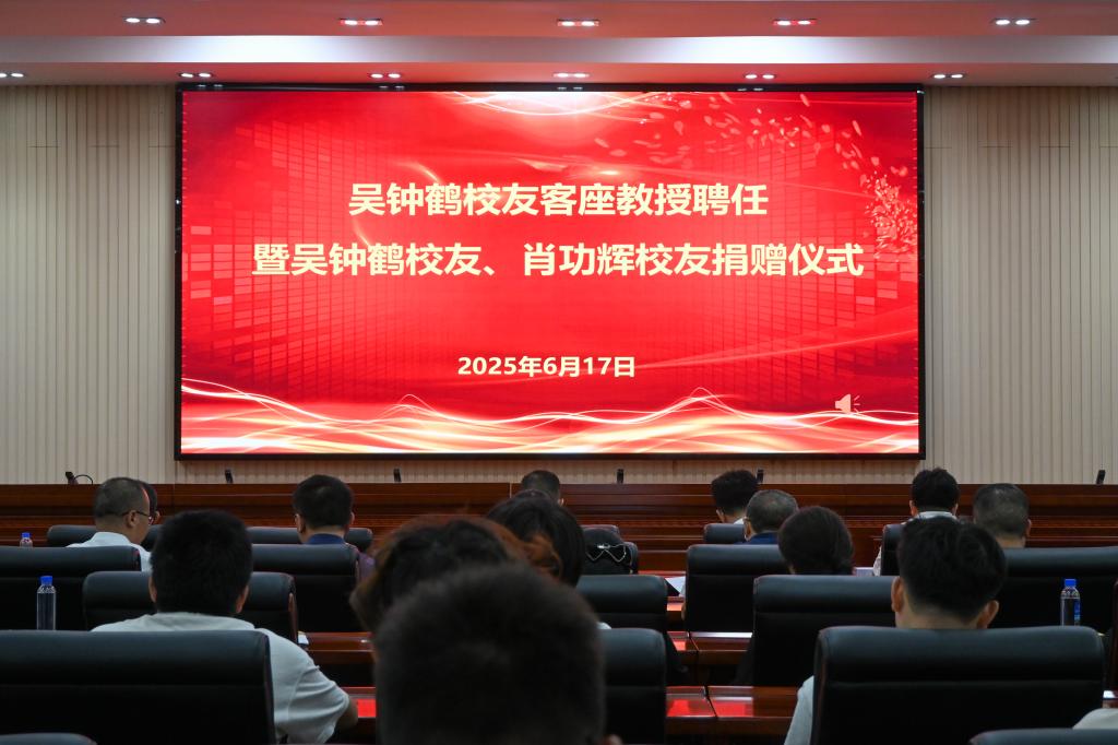 6月17日,吴钟鹤校友客座教授聘任仪式暨广东红球建材科技有限公司、广东新江消防工程有限公司向best365中国官方网站教育基金会捐赠仪式在船山报告厅举行。校党委书记曹执令,党委委员袁勤,江门市衡阳商会会长、广东红球建材科技有限公司总经理、1994届锅炉及压力容器安全专业吴钟鹤校友携夫人,广东新江消防工程有限公司总经理、2006届工程监理专业肖功辉校友携夫人,江门市衡阳商会副会长邱友意,江门市衡阳商会执行秘书长刘亚宁出席仪式。大会由校友联络中心主持。