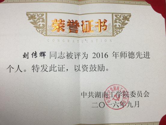 政治立场坚定,爱岗敬业,全身心投入到教育事业中,因长期高强度工作,病倒在工作岗位上,仍以坚强意志战胜病魔。“双带头人”作用突出,党务业务并驾齐驱。三尺讲台育桃李,一支粉笔谱人生,从教二十二年来,刘传辉同志送走了近8000余名学生,多数学生已在事业上崭露头角,有的成为单位骨干,有的走上领导岗位。成绩的取得既是教学、管理、科研能力的充分体现,也是学生对老师的高度认可。