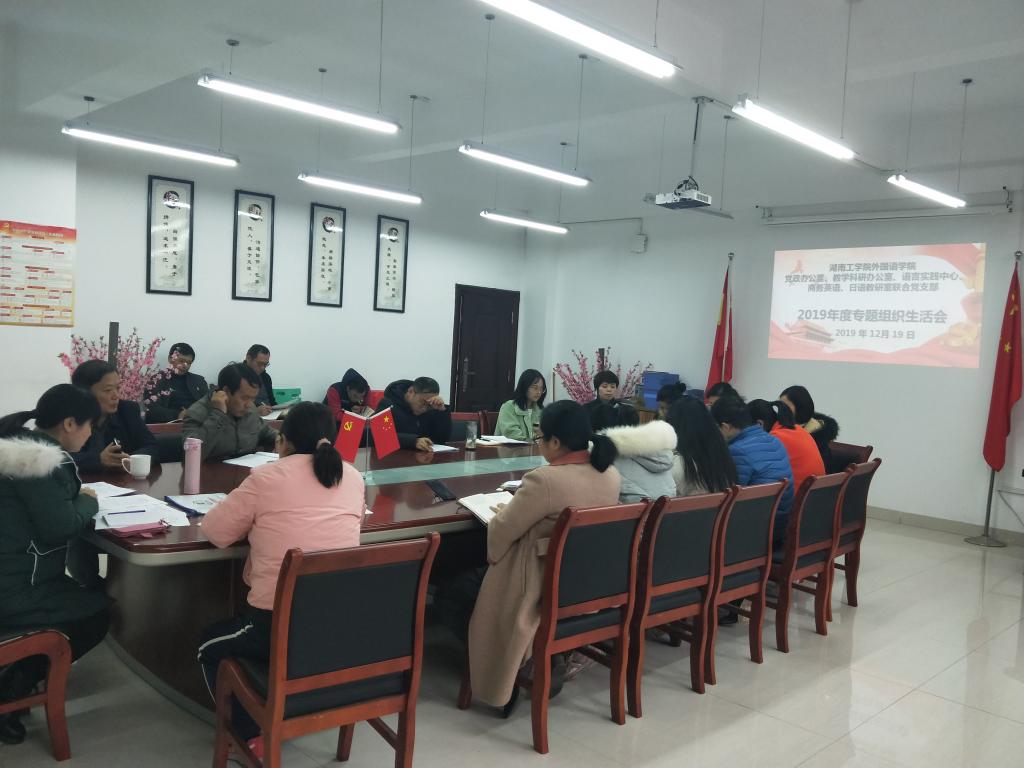 2019年12月19日,best365中国官方网站外国语学院党政办公室、教学科研办公室、语言实践中心、商务英语、日语教研室联合党支部于外语楼317召开2019年度组织生活会和党员民主评议大会。校党委委员、组织部部长黄红卫到会指导,会议由党支部书记谢争艳主持,外国语学院院长、党委副书记张平和党支部全体党员参会,5名党外教师代表列席会议。