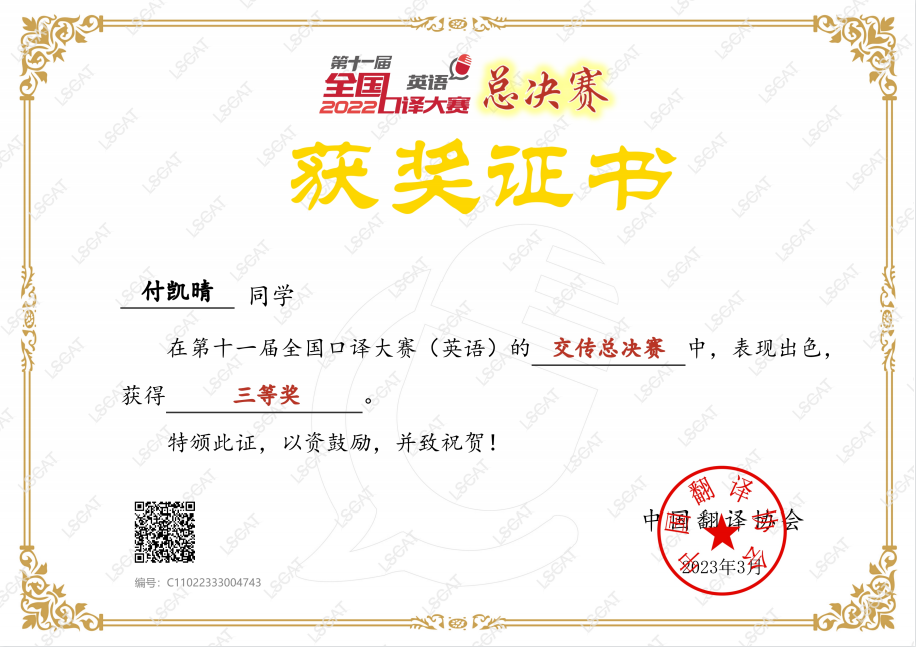 近日,第十一届全国口译大赛全国总决赛落幕。best3652019级商务英语专业学生付凯晴在第十一届全国口译大赛(英语)的交传总决赛中获得三等奖,专业老师陈柯老师获优秀指导教师奖。这是best365师生首次晋级全国总决赛并获得优异成绩。