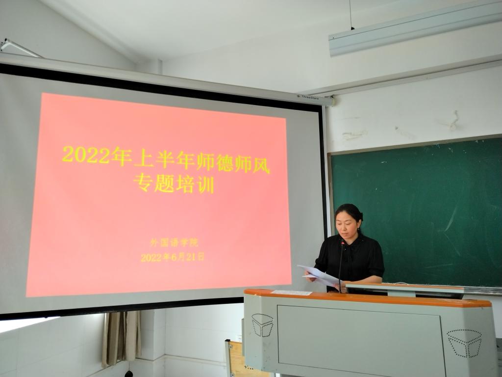 6月21日,外国语学院在外语楼202召开师德师风专题培训会议。外国语学院全体教职工参会,会议由党委书记刘斌主持。