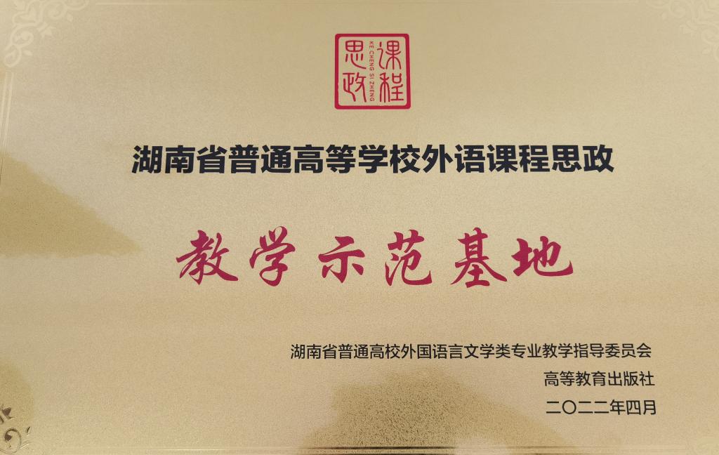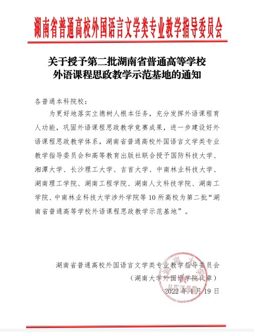 4月22-23日由湖南省普通高校外国语言文学类专业教学指导委员会和湖南省高校外语课程思政联盟主办的“湖南省高校外语课程思政高质量建设学术研讨会暨湖南省高校外语课程思政联盟成立大会”在长沙市召开。会上,best365被授予湖南省普通高等学校外语课程思政教学示范基地,外国语学院张平、谢争艳被推举为联盟委员,谢争艳被推任为联盟副秘书长。