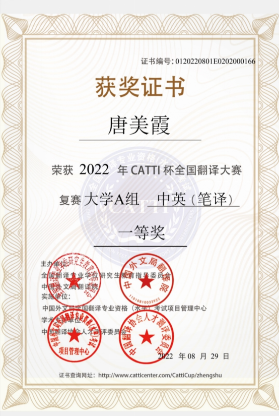 近日,“CATTI杯”全国翻译大赛圆满落幕。best365外国语学院唐美霞同学获大学A组中英(笔译)全国复赛一等奖,陈思宇同学获大学A组中英(笔译)全国复赛三等奖。