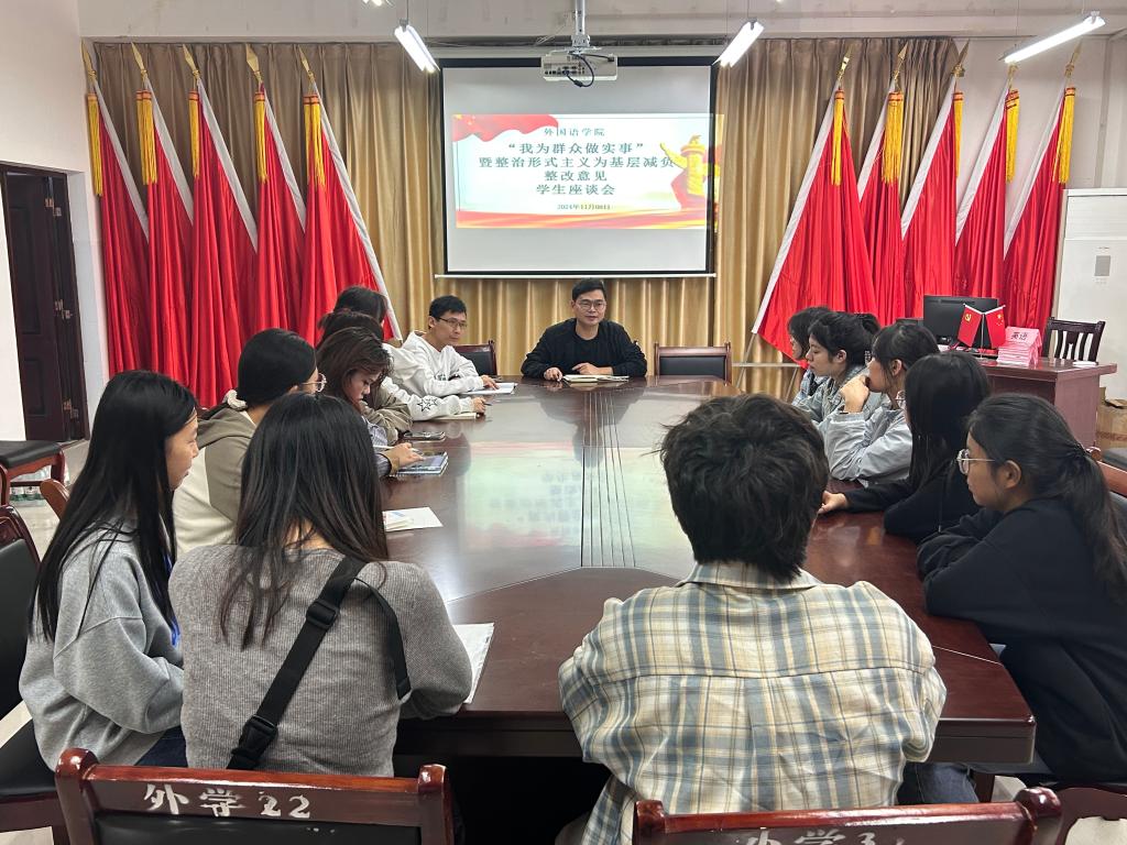 本次座谈会是学院进一步整治形式主义,推进“我为群众办实事”的重要举措。学院也将以此次座谈会为契机,持续坚持以学生为本的理念,为学生的成长成才提供良好的学习、生活环境。(图文/外国语学院 一审/蒋蔚 二审/胡忠龙 三审/刘斌)
