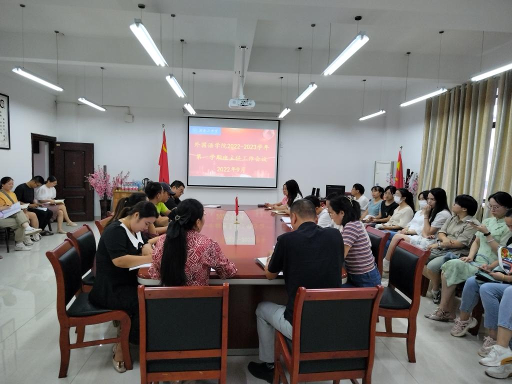 为进一步提升班主任工作能力,增强工作实效,形成三全育人合力,9月29日下午,外国语学院在317会议室召开新学期班主任工作会议。学院党委书记刘斌出席会议,全体班主任和辅导员老师参加会议。会议由党委副书记周艳红主持。