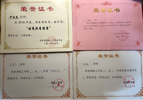 在校期间学习成绩与综合测评成绩连续三年在专业名列前茅,荣获校二等奖学金3次、校优秀学生干部3次、校优秀共青团员1次、校俄语书写大赛二等奖。