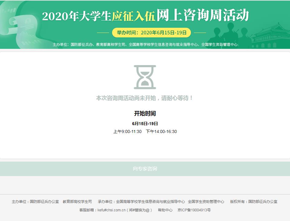 由国防部征兵办、教育部高校学生司、全国高等学校学生信息咨询与就业指导中心、全国学生资助管理中心联合举办的“2020年大学生应征入伍网上咨询周活动”将于6月15日至19日正式启动,本次网上咨询周活动依托全国征兵网和学信网进行,活动入口是https://www.gfbzb.gov.cn/zjzx/show.action欢迎有意参加入伍的同学届时前往咨询!