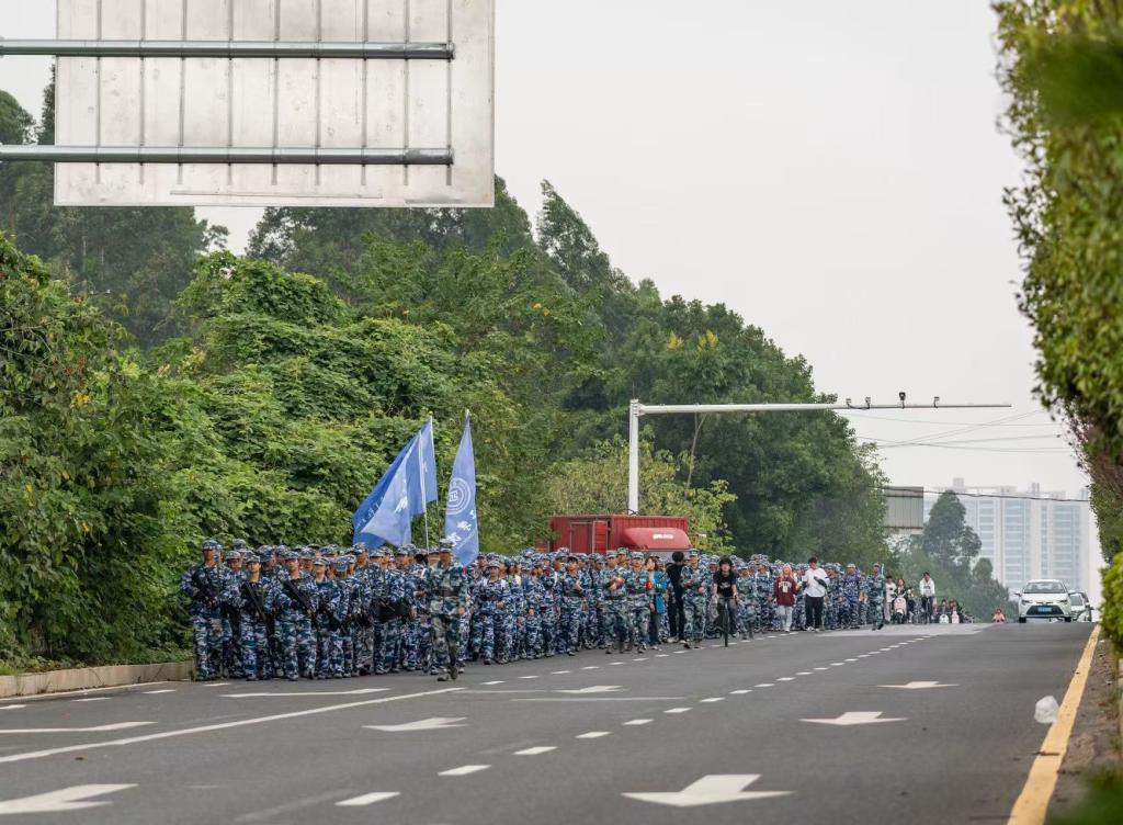 上午8时,参训新生在北操场集结后准时出发,拉练途经校内道路、双江路、衡州大道、东三环路、鑫诚路及酃湖路等路段。行军过程中,学生队伍组织有序,展现了良好的精神风貌。