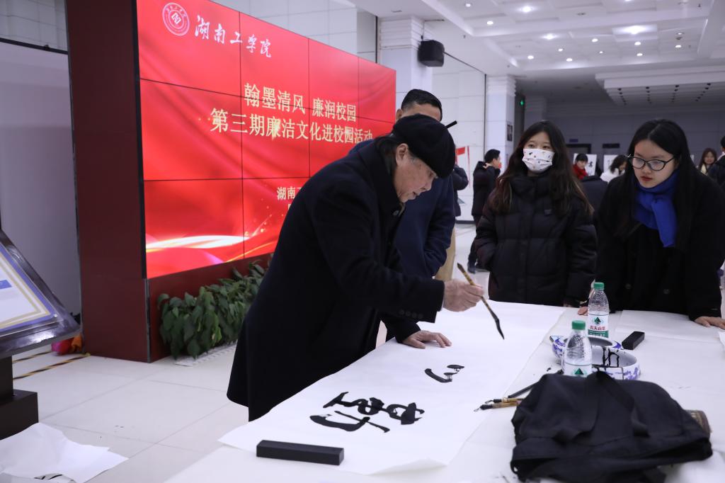 活动中,由雁城书画院院长王益军带队,舒迪柔、毛增禄、罗红卫、易正华等衡阳书法名家与现场的师生们一起创作书法作品,交流创作技艺和心得,现场气氛热烈。字里行间尽显廉洁文化的精神,给师生们留下了深刻的印象。活动在图书馆一楼大厅设置“廉洁长廊”,开展雁城书画院及best365书法协会师生书法作品展,通过生动的笔触展现了廉洁的内涵与意义,吸引了众多师生驻足观看。