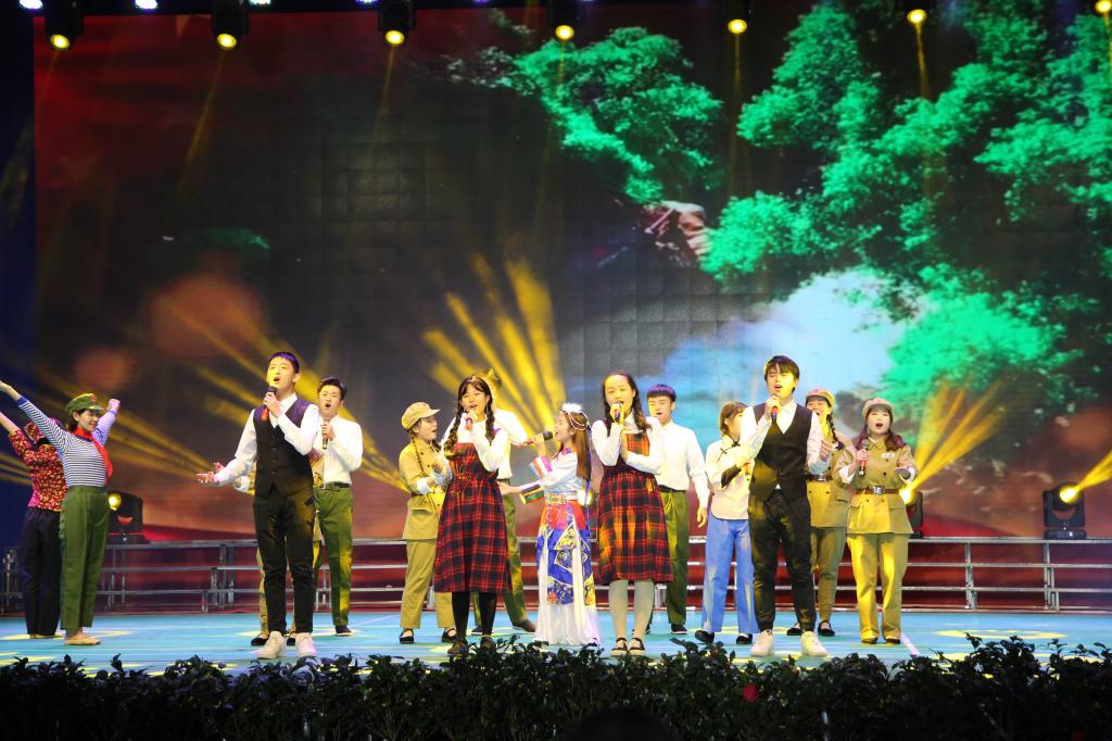 △晚会即将结束,现场师生全体起立,齐唱《没有共产党就没有新中国》,用嘹亮的歌声讴歌伟大中国共产党,表达了永远跟党走的坚定信念