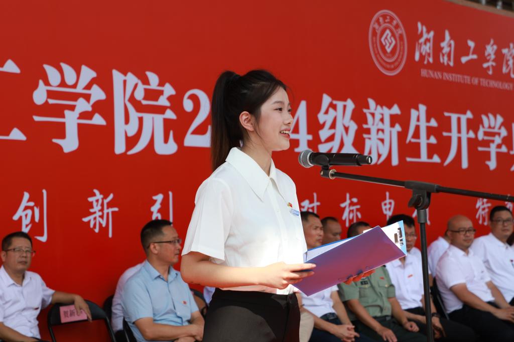 材料2401班喻吉作为新生代表分享了初遇湖工的感受,号召广大新生共同携手,坚定理想信念,就过硬本领,敢于创新实践,在湖工这片沃土上奏响新的华章。