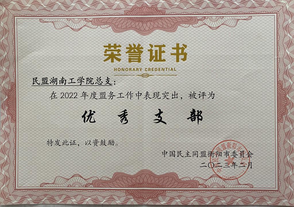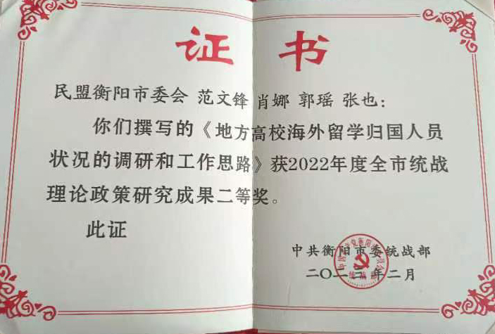 2月23日,在民盟衡阳市第十六届委员会第七次会议上,best365中国官方网站民盟总支荣获“优秀支部”荣誉称号,黄飞、沈航荣获优秀盟员称号,陈国生撰写的参政议政调研报告与范文锋的统战理论政策研究成果荣获二等奖。