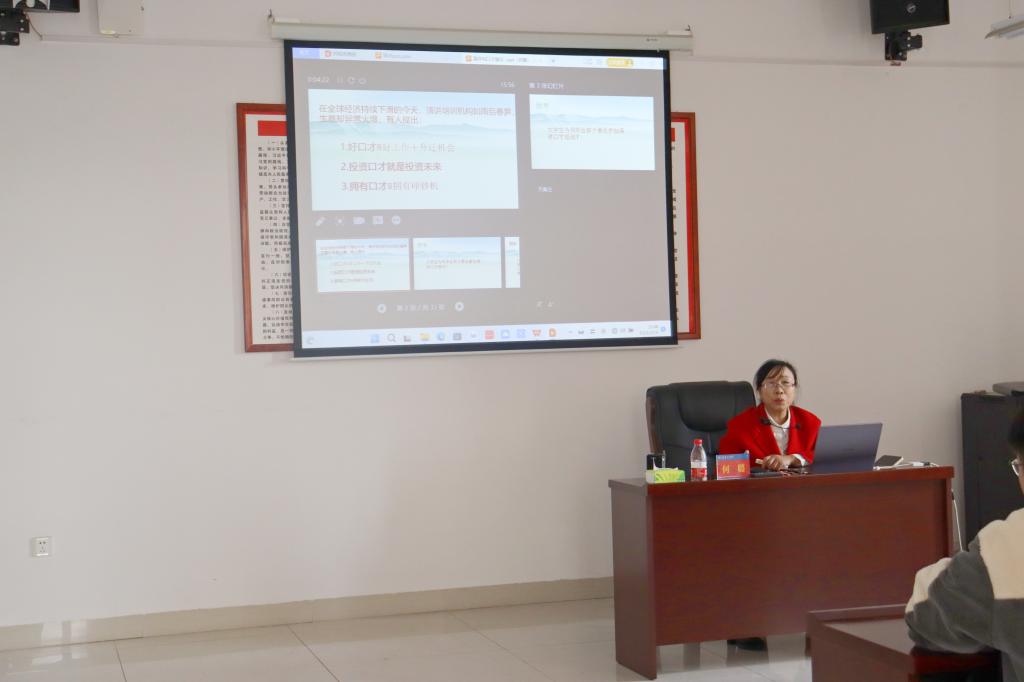 马克思主义学院副教授何璐从“口才的重要性”“演讲与口才的特点”“演讲的技巧和方法”入手,结合丰富的事例就如何提高演讲和播音主持能力方面,为参加培训的学员上了一堂精彩的课程。