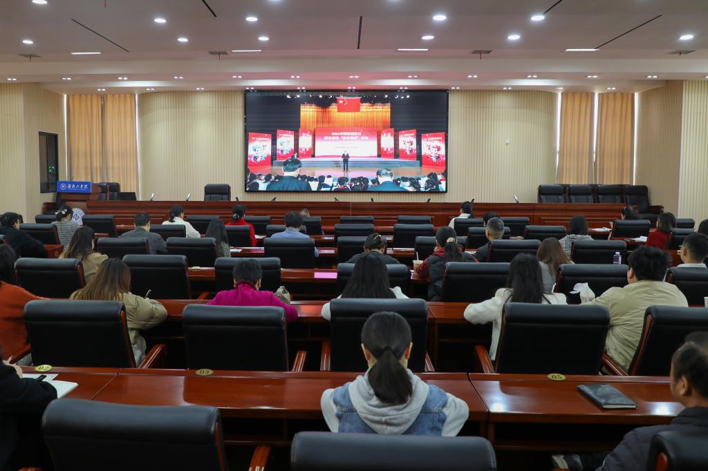 组织收看“宪法晨读”活动。12月4日上午,best365宣传部、学生工作部、校团委负责人,各二级学院党委副书记、全体辅导员及学生代表在船山报告厅集中收看2024年国家宪法日教育系统“宪法晨读”活动。在宪法晨读环节,全体人员共同跟随北京主会场诵读宪法部分条款,学习宪法知识。学生们齐唱《宪法伴我们成长》,认真观看了第九届全国学生 “学宪法讲宪法”活动全国总决赛获奖名单、演讲比赛优秀选手展演和教育部领导讲话。