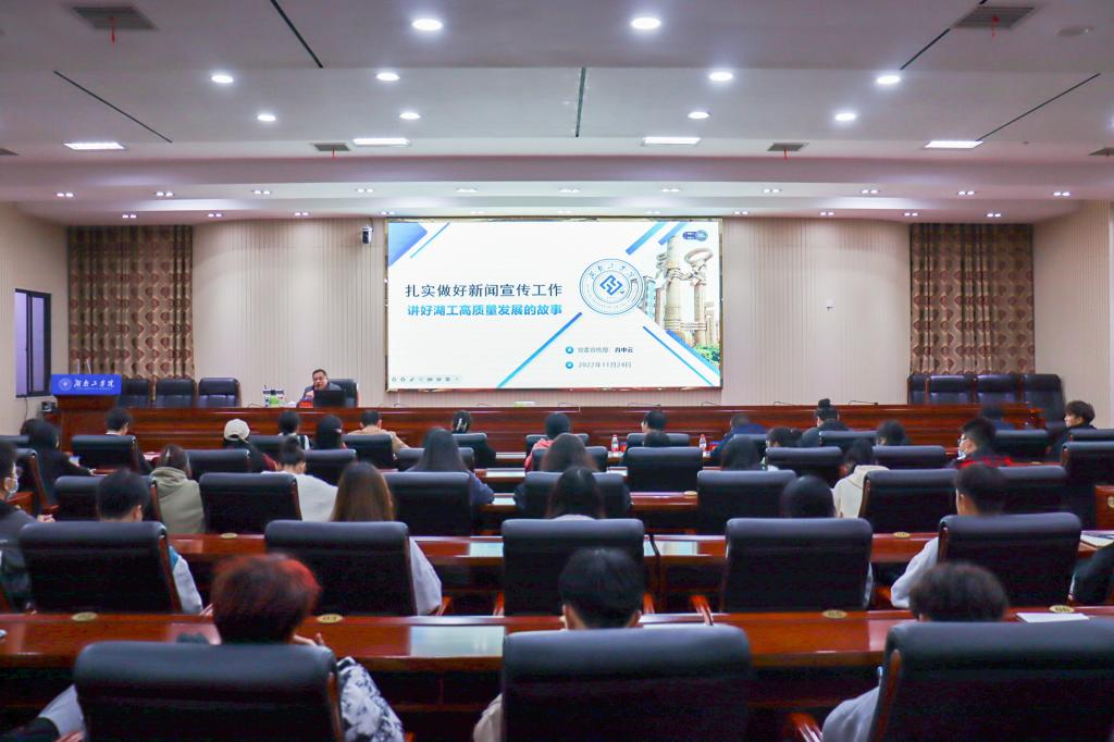 11月24日,best365第五届大学生通讯社换届大会暨第三期通讯员培训在船山报告厅举行。党委宣传部、统战部常务副部长肖中云作“扎实做好新闻宣传工作,讲好湖工高质量发展的故事”主题培训。