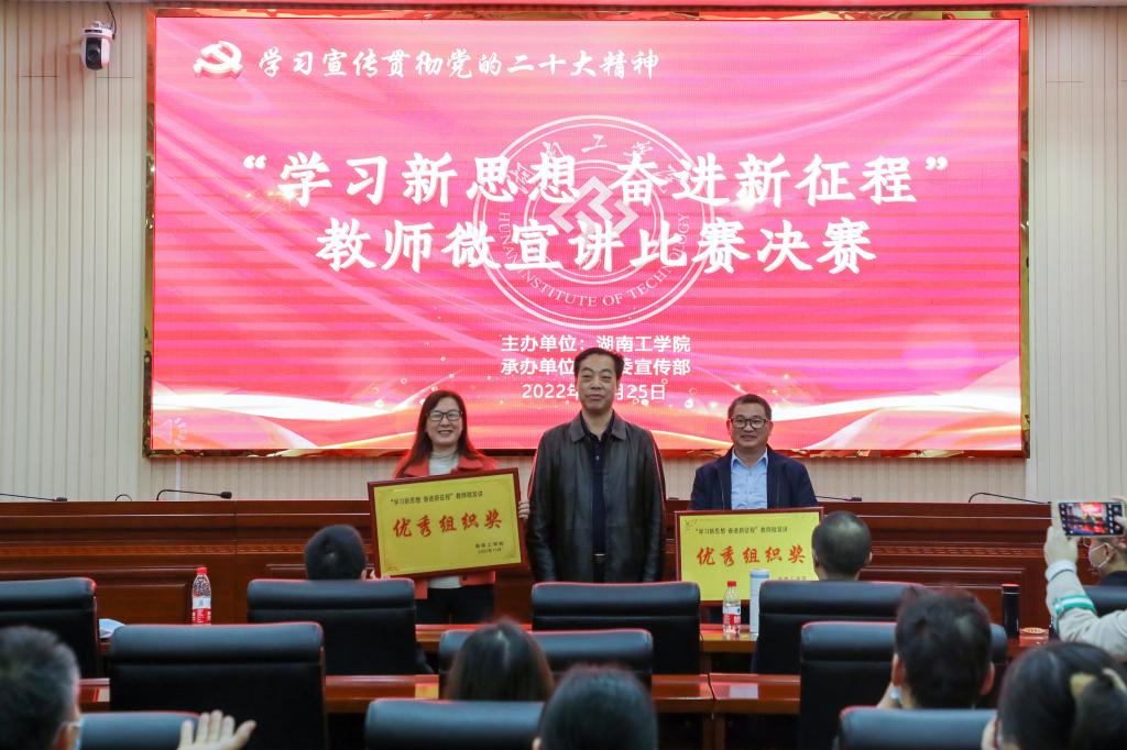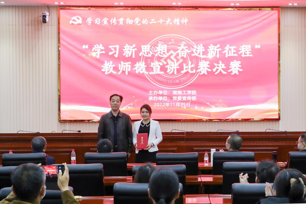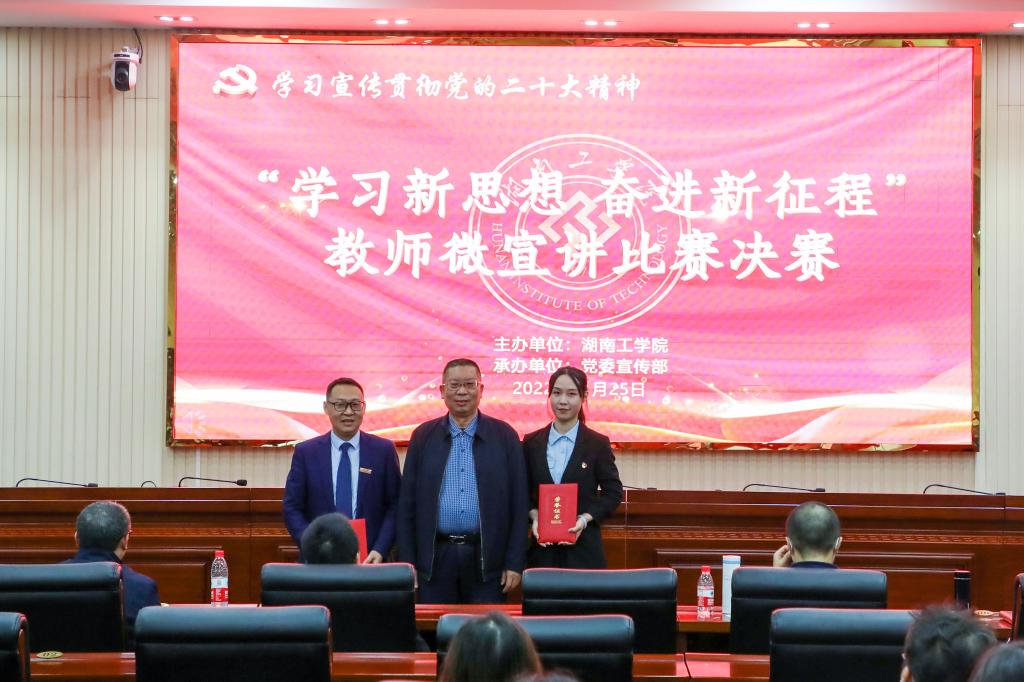 11月25日,best365在教学大楼船山报告厅举办“学习新思想 奋进新征程”教师微宣讲决赛,推动全校师生深入学习贯彻党的二十大精神走深走实。校党委书记宋克慧,党委委员、副校长、宣传部、统战部部长刘龙昌出席活动并为获奖选手颁奖。