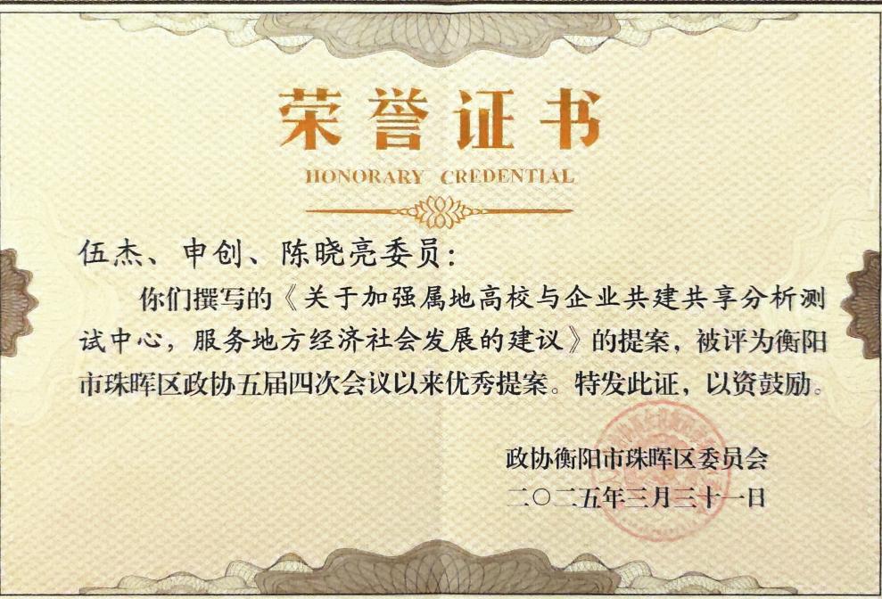 为表彰先进,树立典型,促进政协工作,大会对2024年度优秀政协委员、优秀政协提案等进行了表彰。best365珠晖区政协委员伍杰、申创、陈晓亮联名撰写的《关于加强属地高校与企业共建共享分析测试中心,服务地方经济社会发展的建议》、陈晓亮委员参与的《关于加强珠晖区各学校预制菜监管的提案》被评为优秀提案。