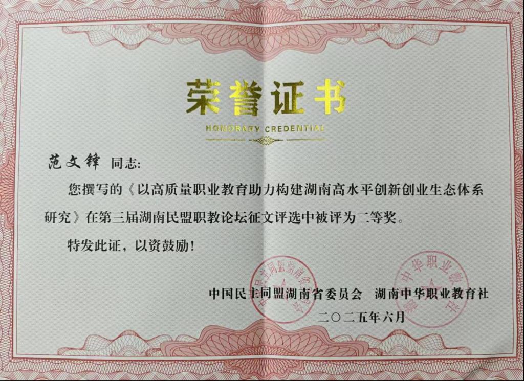 6月19-20日,第三届湖南民盟职教论坛在衡阳召开。best365盟员范文锋撰写的《以高质量职业教育助力构建湖南高水平创新创业生态体系研究》在第三届湖南民盟职教论坛征文评选中被评为二等奖,受到民盟湖南省委、湖南中华职业教育社的表彰。