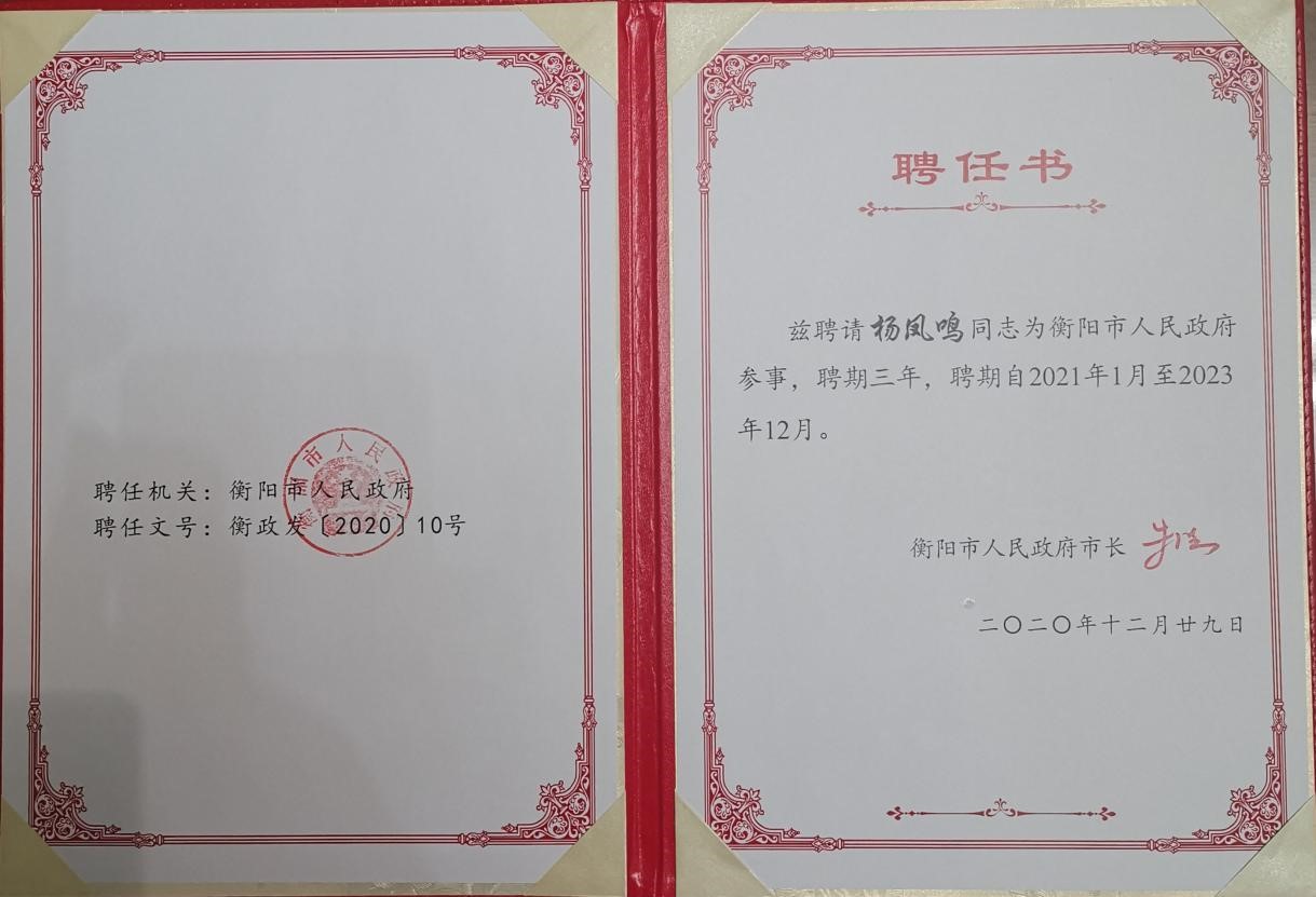 会上,衡阳市委副书记、市人民政府市长朱健为首批获聘的参事颁发聘书。best365审计处处长、市政协委员、九三学社湖工支社副主委杨凤鸣教授获聘为首批参事。