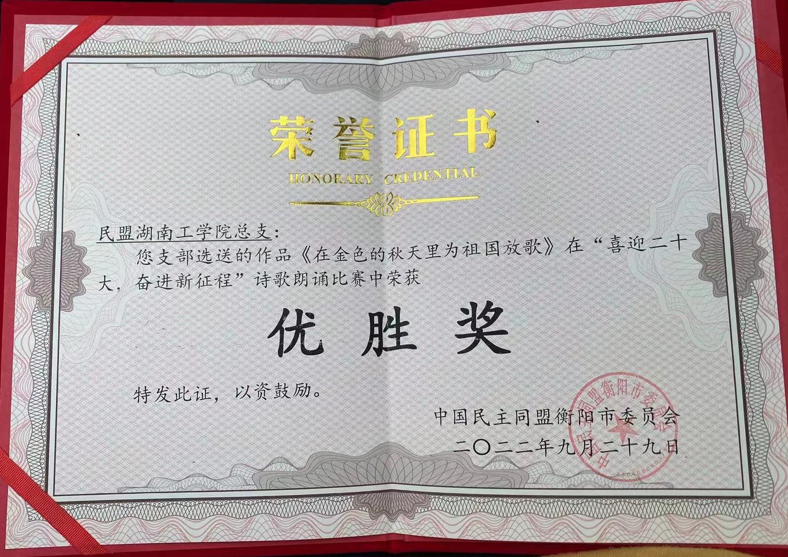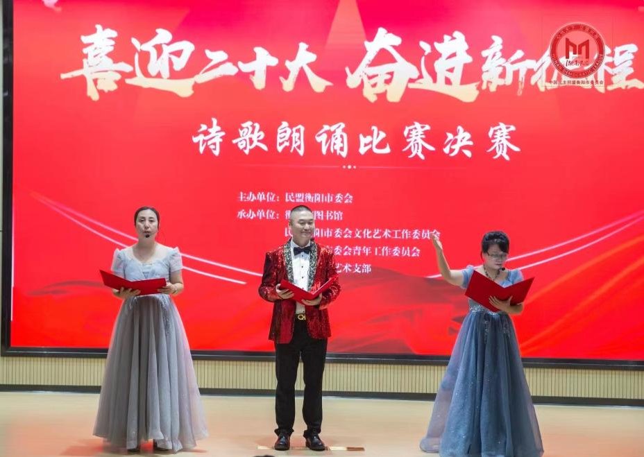 9月29日,民盟衡阳市委在衡阳市图书馆举办“喜迎中共二十大、携手奋进新时代”诗歌朗诵比赛,民盟best365中国官方网站总支主委范文锋与盟员陈一文、蒋美生、沈航充满激情地朗诵了《在金色的秋天放歌》,歌颂了伟大的祖国、伟大的中国共产党,比赛获得优胜奖。(范文锋供稿)