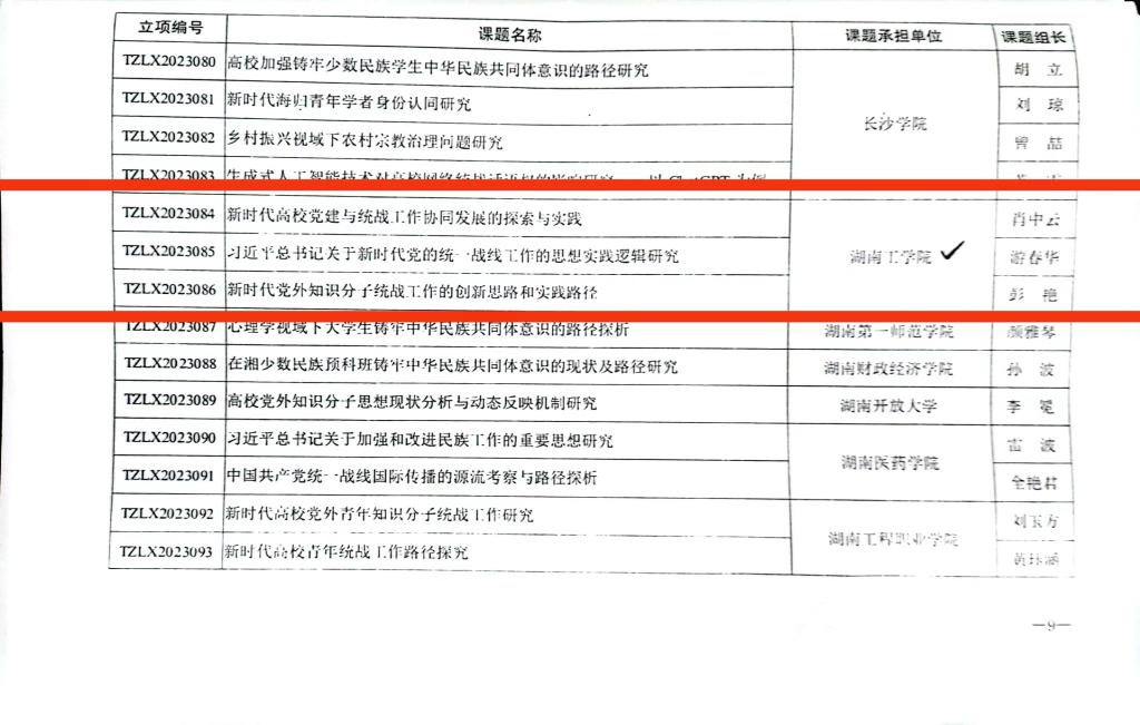肖中云教授的《新时代高校党建与统战工作协同发展的探索与实践》、游春华教授的《习近平总书记关于新时代党的统一战线工作的思想实践逻辑研究》和彭艳老师的《新时代党外知识分子统战工作的创新思路和实践路径》获省委统战部立项;范文锋教授的《新时代民主党派参与社区基层治理的理论与实践研究》、陈国生教授的《乡村振兴背景下我省村集体经济发展现状研究》、黄飞教授的《湖南开放型经济高质量发展现状与对策研究》获民盟湖南省委会2023年度立项。(范文锋)