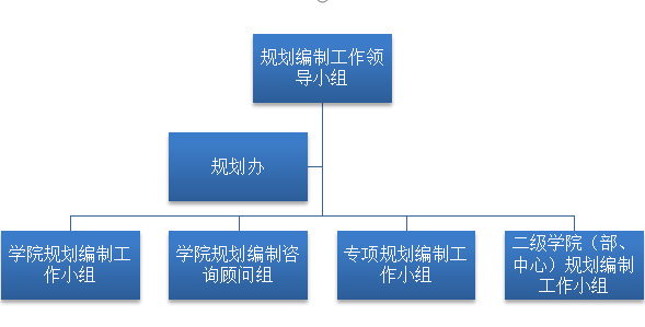 第五条 规划编制的组织机构。成立由学院党委书记、院长任组长的规划编制工作领导小组,全面负责学院规划编制工作的组织领导和协调工作;领导小组下设办公室(简称规划办),设在发展规划和校企合作处,负责发展规划工作的研究部署、协调各方、督查督办、考核评估;成立由学院分管规划工作的院领导任组长的学院规划编制工作小组,负责学院发展规划的调研、起草、意见征求、专家论证,解决规划编制过程中的重大问题;成立由分管院领导任组长的专项(专题)规划编制工作小组,负责各专项(专题)规划的编制工作;成立由二级学院(部、中心)党政负责人任组长的二级学院(部、中心)规划编制工作小组,负责二级学院(部、中心)规划的编制工作。