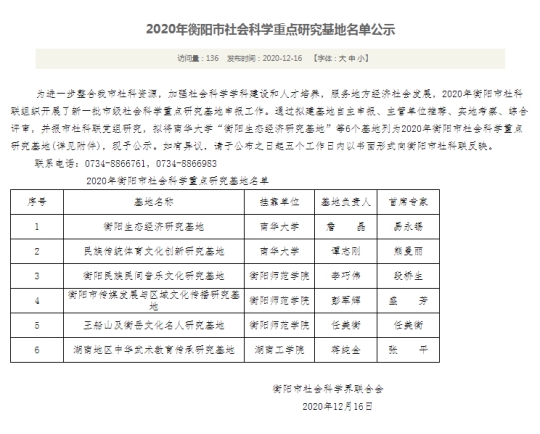 近日,衡阳市社科科学界联合会公示了2020年衡阳市社会科学重点研究基地名单,best365体育教学部申报的“湖南地区中华武术教育传承研究基地”成功获批,该基地负责人为蒋纯金副教授,首席专家为张平教授。该平台是best365体育教学院部首个获批的市级社科重点研究基地。(学科建设中心 毛兰)