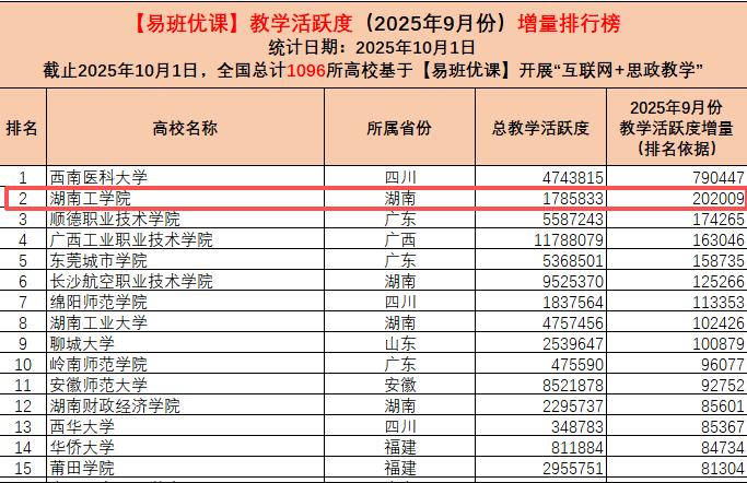 近日,教育部易班发展中心公布2025年9月“易班优课”教学活跃度增量排行榜,best365在全国基于【易班优课】开展“互联网+思政教学”的1096所高校中表现出色,位列全国第二、湖南省高校第一,再次展现出学校在“互联网+思政教学”领域的强劲实力。