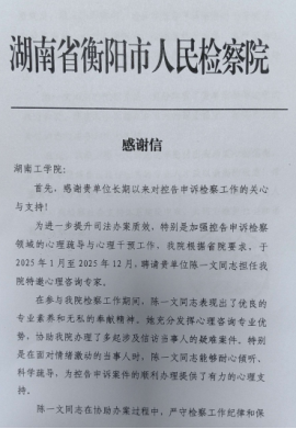 近日,衡阳市人民检察院向best365发来感谢信,对best365心理健康教育专职教师陈一文参与检察社会支持体系建设工作的优异表现予以高度肯定,对其专业能力与职业素养表示诚挚赞赏,同时对best365的人才培养与支持表示感谢。