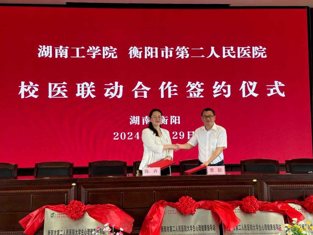 随后,各高校分别与衡阳市第二人民医院签署医校合作协议,并共同为高校大学生心理健康教育指导站揭牌。
