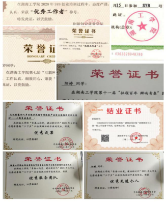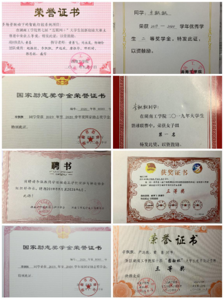 在校期间获得国家奖学金1次、国家励志奖学金2次、校优秀学生一等奖学金3次、校优秀共青团干1次、校优秀共青团员2次、优秀班干部1次。此外,荣获湖南省挑战杯竞赛三等奖、校互联网+创新创业大赛一等奖、校电子商务大赛二等奖、校圆融杯电子设计大赛二等奖、院主持人大赛一等奖、院职业生涯规划大赛一等奖、院爱国主题征文比赛一等奖等奖项。