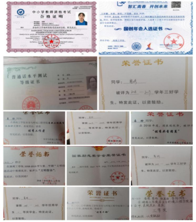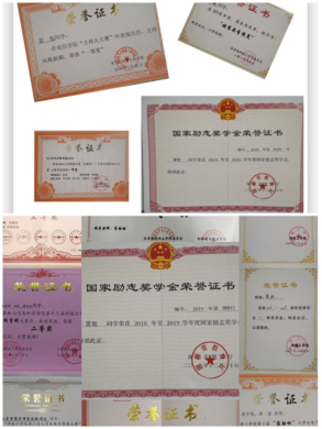 在校期间连续三年班级成绩和综测均为第一,荣获国家奖学金1次,国家励志奖学金2次,校级特等奖学金1次,校级一等奖学金2次、校三好学生2次,校优秀干部1次,校优秀团员干部1次,三下乡优秀个人1次。