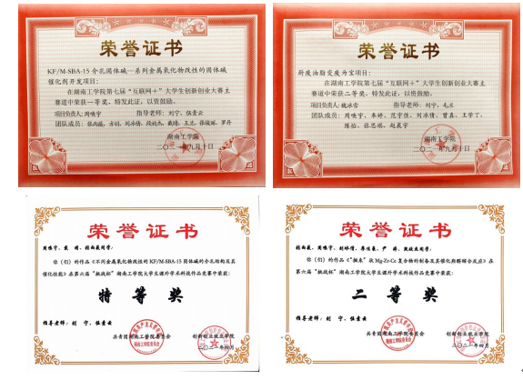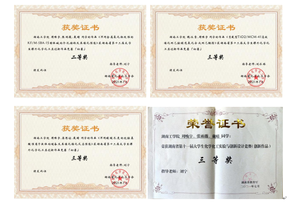 2021年上半年,获得湖南省第十三届大学生课外化学化工类创新作品竞赛二等奖1项、三等奖2项,湖南省第十一届大学生化学化工学科竞赛三等奖1项。
