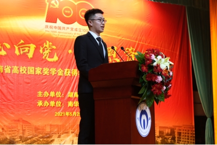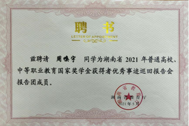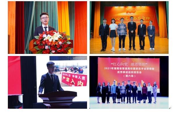 在2021年他经过层层选拔,被聘请为湖南省优秀事迹巡回报告团成员,参加了两场“红心向党·感恩资助”湖南省优秀事迹巡回报告会。