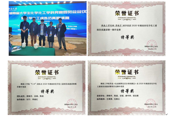 在2020年下半年,湖南省举办首次化学化工虚拟仿真比赛,周唤宇同学抓住机会,代表学校出战。经过激烈竞争,周唤宇同学提交的作品《比表面积孔径的分布测定》获参赛项目特等奖;由他带领的C.H.队获得湖南省虚拟仿真操作竞赛团体特等奖;并且在操作个人赛中,周唤宇以95.6的成绩获得特等奖。